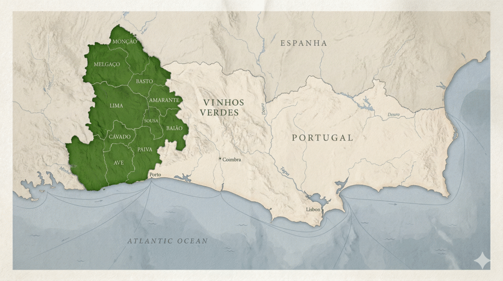 Para responder o que é vinho verde, é preciso olhar a geografia. A Região Demarcada dos Vinhos Verdes fica no extremo norte de Portugal, na zona do Minho, e funciona como DOP/DOC que regulamenta práticas locais. As regras ajudam a preservar características típicas da área.